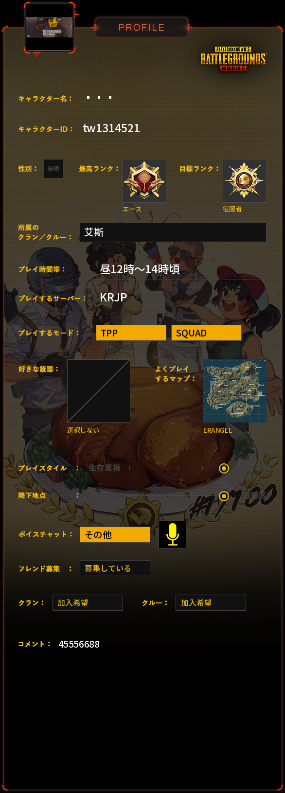 PUBG MOBILE プロフィール